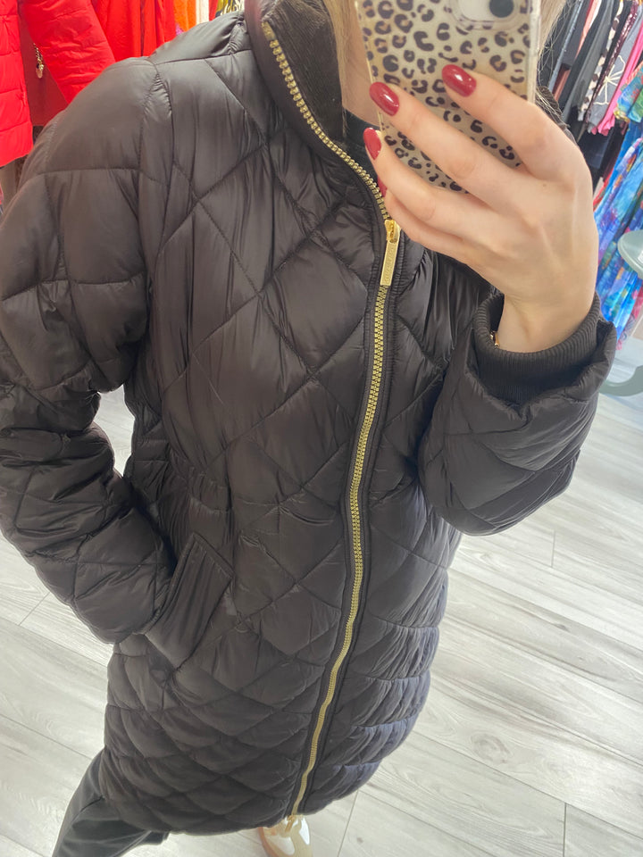 Our long chocolate quilted jacket is designed to keep you warm and stylish. It features a spacious fit, high collar, and practical side pockets. Made from lightweight materials, ensuring all-day comfort. Perfect for both everyday wear and special occasions during the colder months.