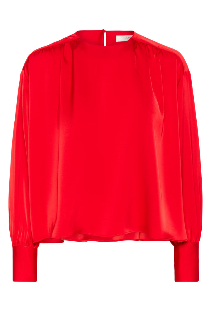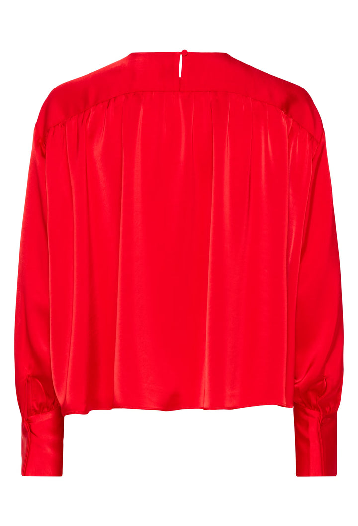 Blouse with relaxed fit showcases elegant round neckline, long sleeves with button cuffs, and fluid silhouette. Comfort meets timeless style, perfect for versatile outfits from work to evening