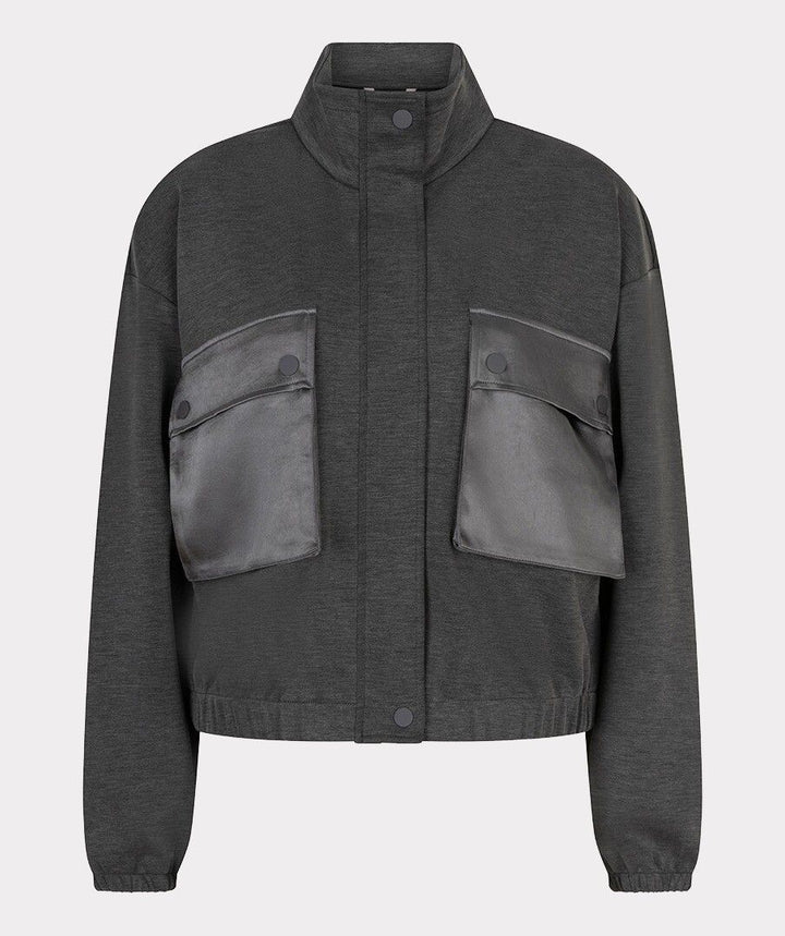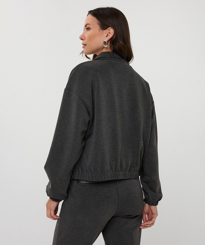 Dark grey bomber style cardigan in modal featuring full zip, long sleeves and two front satin pockets, pair it with the matching trousers for a elevated casual look.