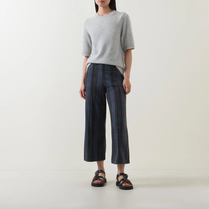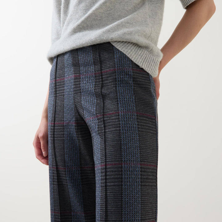 - Mid-rise, wide leg, cropped length, pull-on style, clean hems, tonal check print pattern