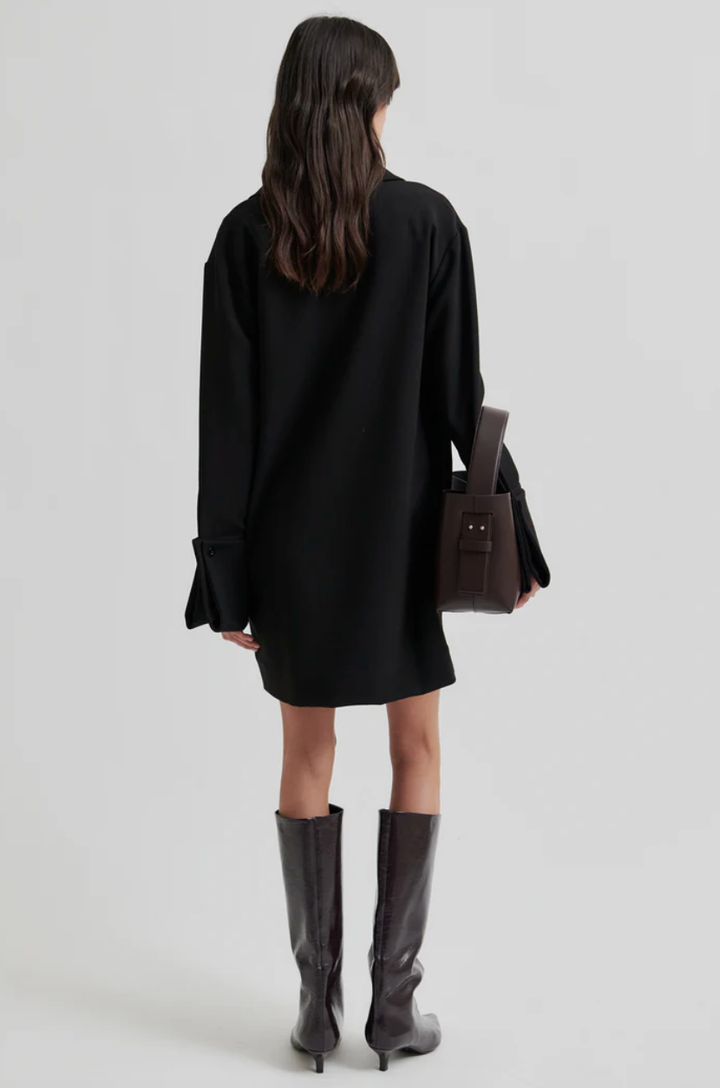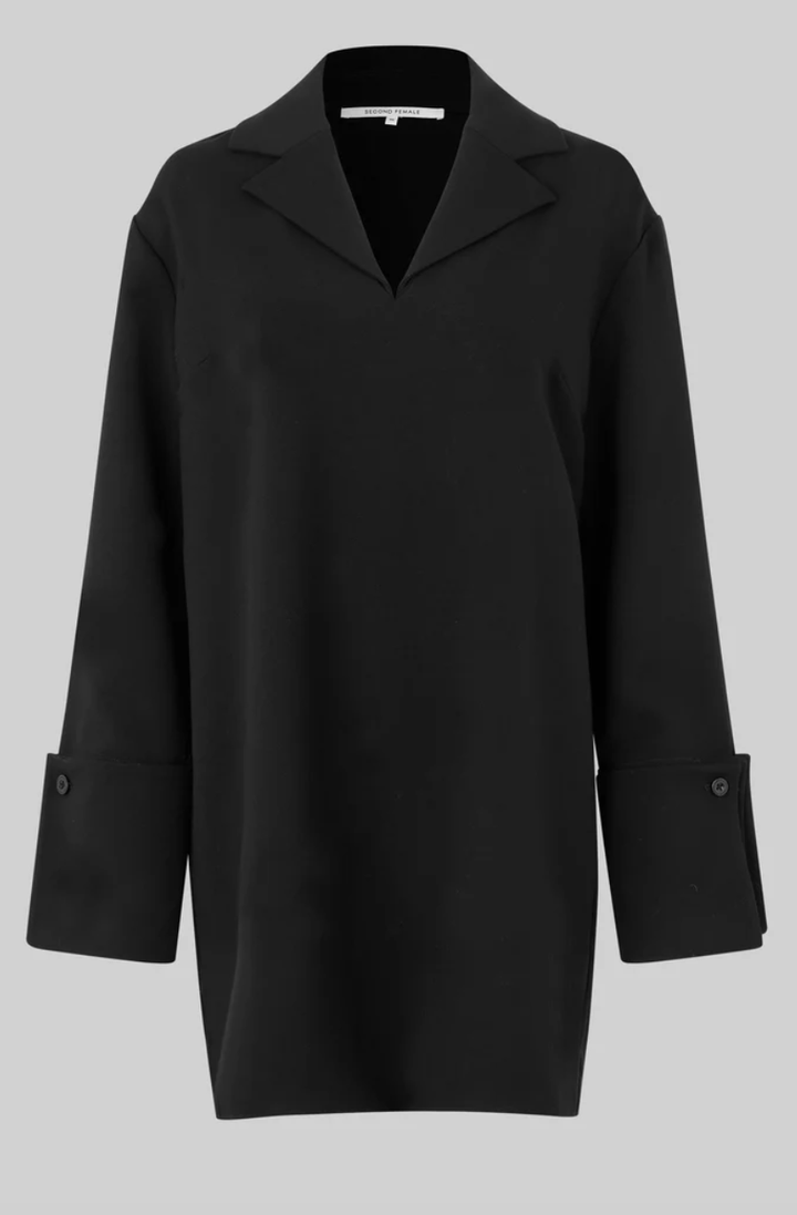 This Second Female dress is crafted from a soft, drapy fabric for a comfortable, flowing feel. It features a lapel collar, long sleeves with wide double-layered cuffs finished with button closures, and small side slits for ease of movement. The straight, boxy fit gives it a modern, relaxed silhouette.