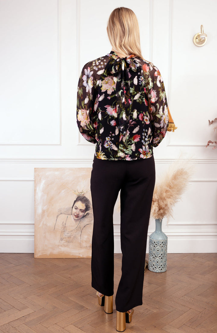 Hope & Ivy’s The Juni Mae blouse is a stylish choice for pairing with skirts and trousers alike. It’s cut from sheer georgette that’s woven with gold lurex feathers, then patterned with multicoloured florals on a black base. This gorgeous stand-out piece is lined through the body for reassuring coverage.